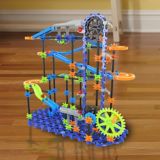 Drop 3 weighted chime balls down the interchangeable tracks of this oversized marble run building system.